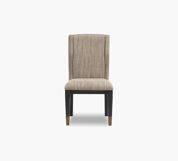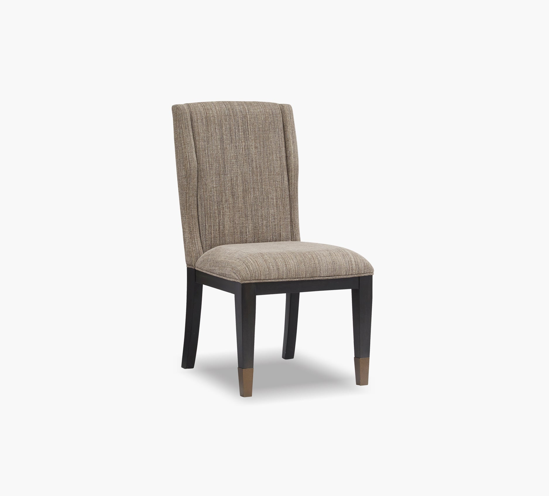 The Ryker Espresso Side Chair offers a sleek, contemporary design with a fully upholstered tan seat and back for comfort and style. The center of the back is accented with a striking brass-tone fretwork insert layered over black upholstery, creating a bold visual detail. Aged brass metal caps on the front legs add a refined touch to the modern silhouette. Upholstered in 100% polyester with a cleaning code of W, this chair is designed for easy care and lasting beauty, supporting up to 300 lbs.