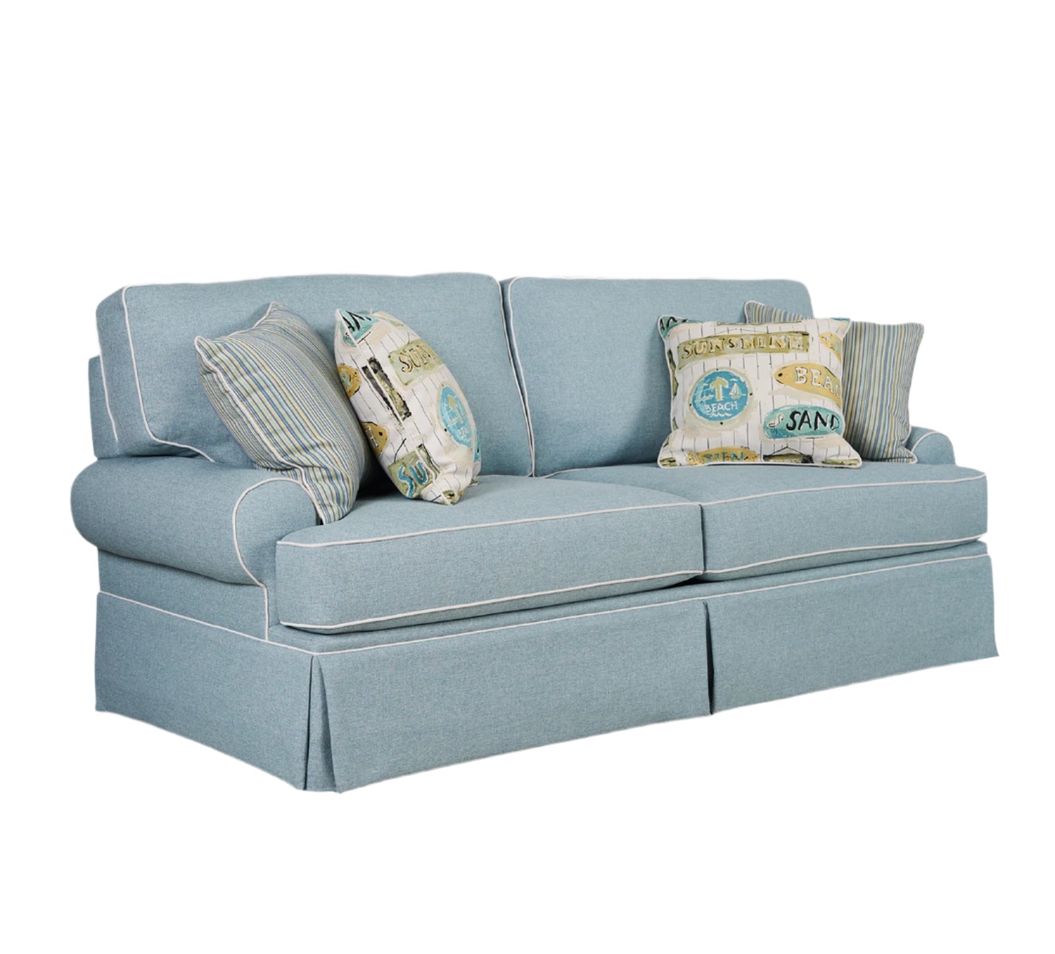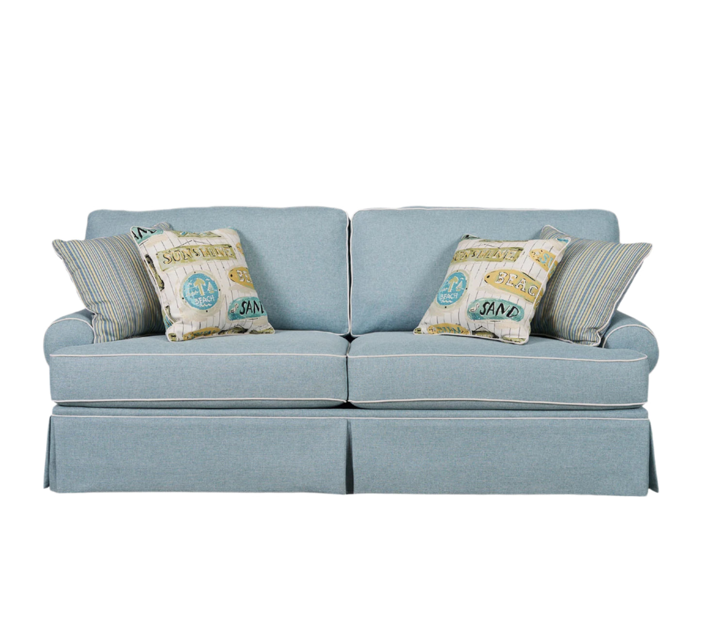 Give your living room a two-tone coastal style with a seaside glow. The Sandbridge has coastal-inspired colors that are combined with a transitional roll arm style, tailored contrast welts, and kick-pleat skirt. This sofa includes 2 striped and 2 novelty beach fabric throw pillows. Reversible seat and back cushions for your stylistic desires!