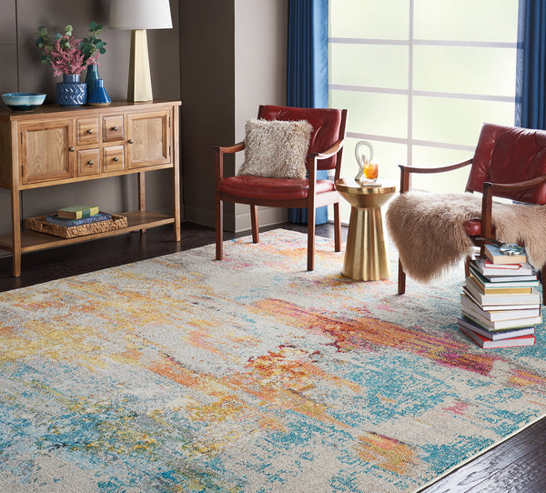 Like coral reefs along a sandy shoreline, this supremely breathtaking area rug is awash with color. It seems to teem with oceanic life as its deep blues, vivid red-orange and gleaming yellow tones flow beautifully from one to the other.