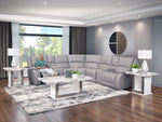 Top grain leather everywhere you sit matched with vinyl on the outside and back. Contemporary modular power reclining sectional in a light grey leather. Wallhugger design saves space while 40"" tall back provides comfort and support. Features pad-over arms, tufted backs, and pad-over chaise ottomans. Includes USB and USB-C ports in the control panels. Console includes 2 USB ports, cupholders, deep cavity storage, and a soft-close lid. Overall dimensions as shown: 90"" x 105"""