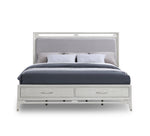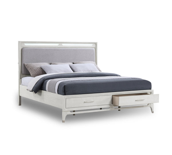 Beautifully crafted lighted upholstered headboard constructed of poplar solids with oak embossing on poplar veneers in a Soft Oatmeal finish. Two storage drawers in the footboard