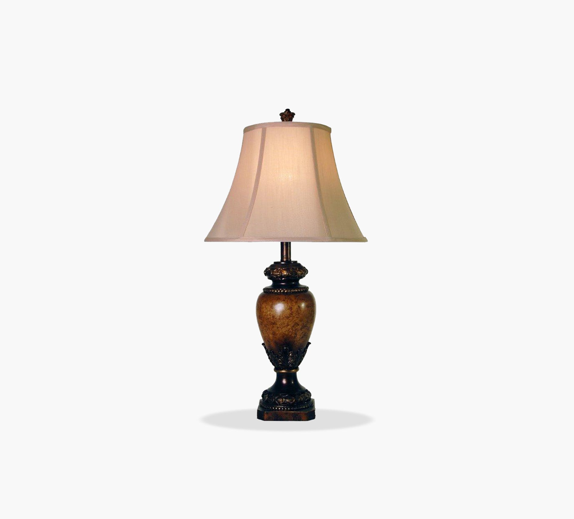 The Sienna traditional table lamp showcases a highly embellished frame with a brown finish and a matching finial. A bell-shaped taupe fabric shade completes the gorgeous base. An elegant accent for a living room, office, or hallway, this lamp also works well on a dining room buffet or a bedroom nightstand.