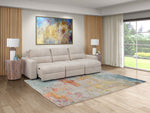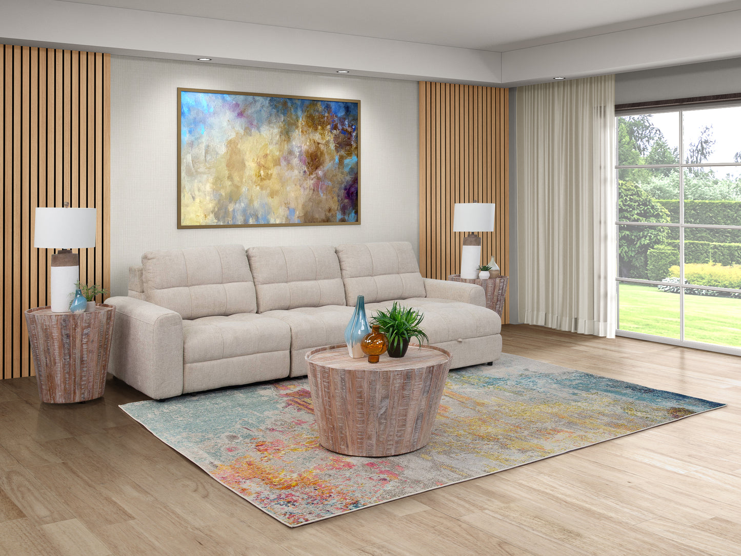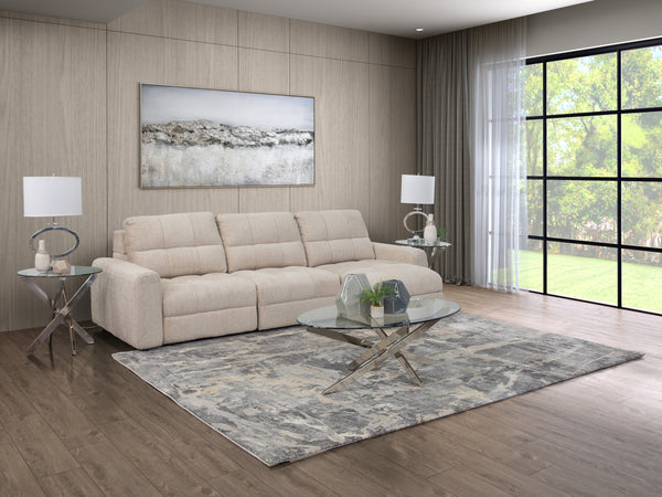 Contemporary motion sectional upholstered in a light beige polyester fabric. Unique sliding seats include a hidden motion feature that extends 17 inches to offer additional seating depth and comfort. Chaise includes hidden storage under the seat cushions. 100% Polyester CC: S