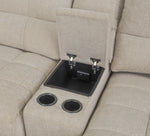 Contemporary motion sectional upholstered in a light beige polyester fabric. Unique sliding seats include a hidden motion feature that offers additional seating depth and comfort. The console includes USB/USB-C charging, removable stainless steel cupholders and a storage compartment with lid. Chaise includes hidden storage under the seat cushions. 100% Polyester CC: S