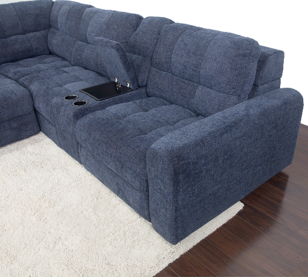 Contemporary motion sectional upholstered in a dark blue polyester fabric. Unique sliding seats on the ends include a hidden motion feature that extends 17 inches to offer additional seating depth and comfort. 100% Polyester CC: S