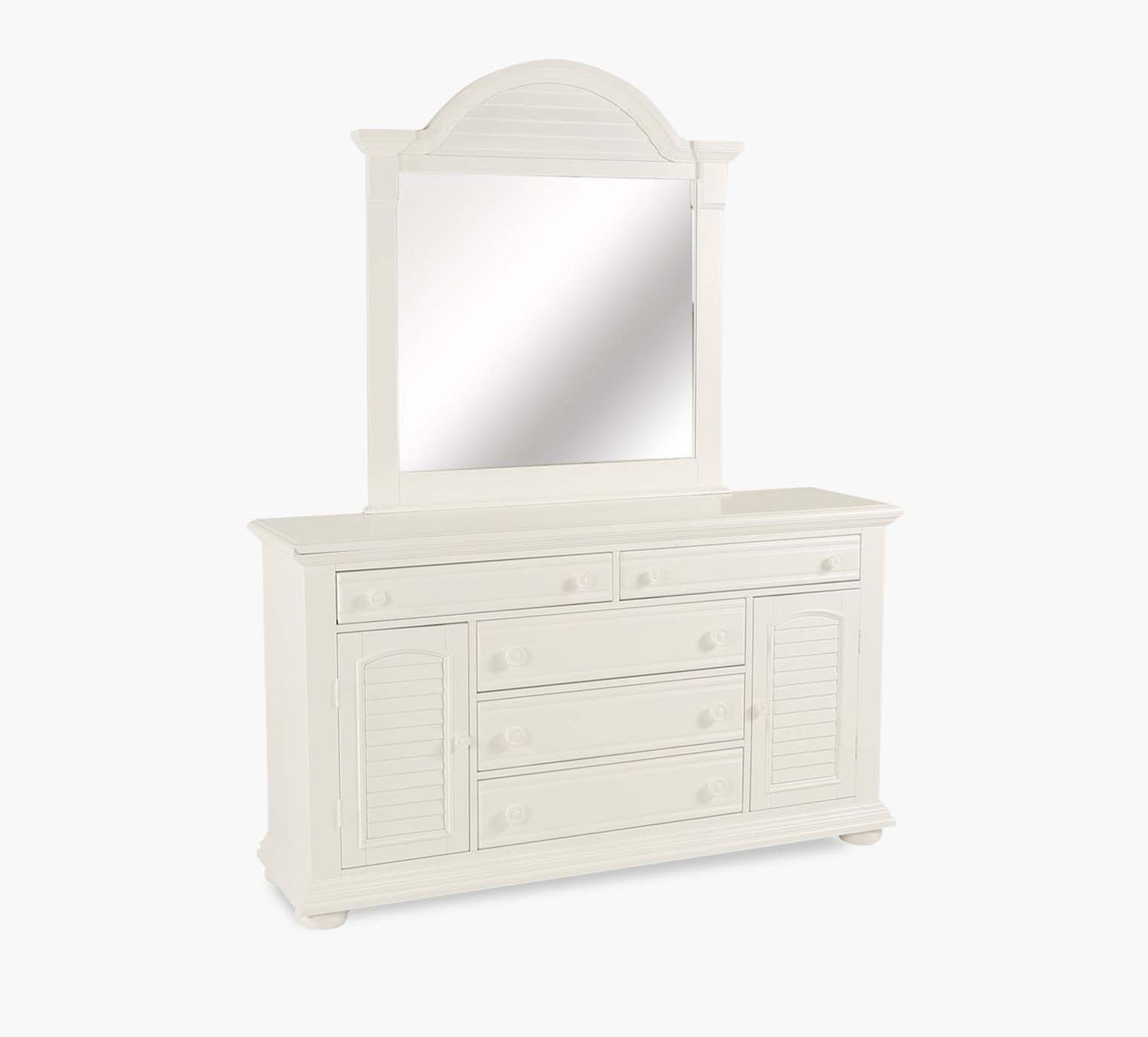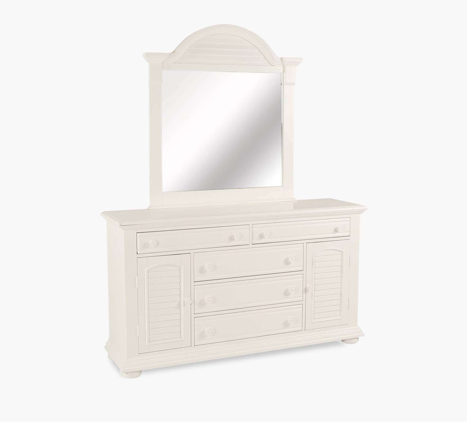 Add a touch of coastal charm with the Summer House White mirror. Its graceful arched crown top and louvered insets create a breezy, tropical feel that makes every day feel like a vacation. Designed to pair beautifully with the matching dresser, this mirror brings light and elegance to your bedroom while enhancing the relaxed style of the collection. Dresser sold separately.