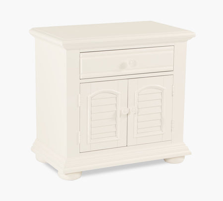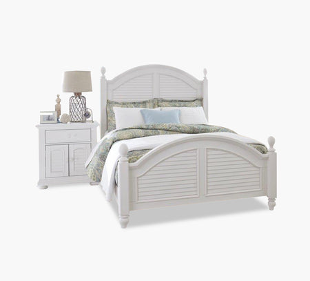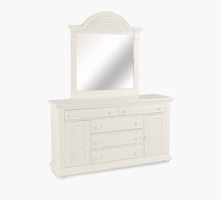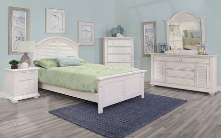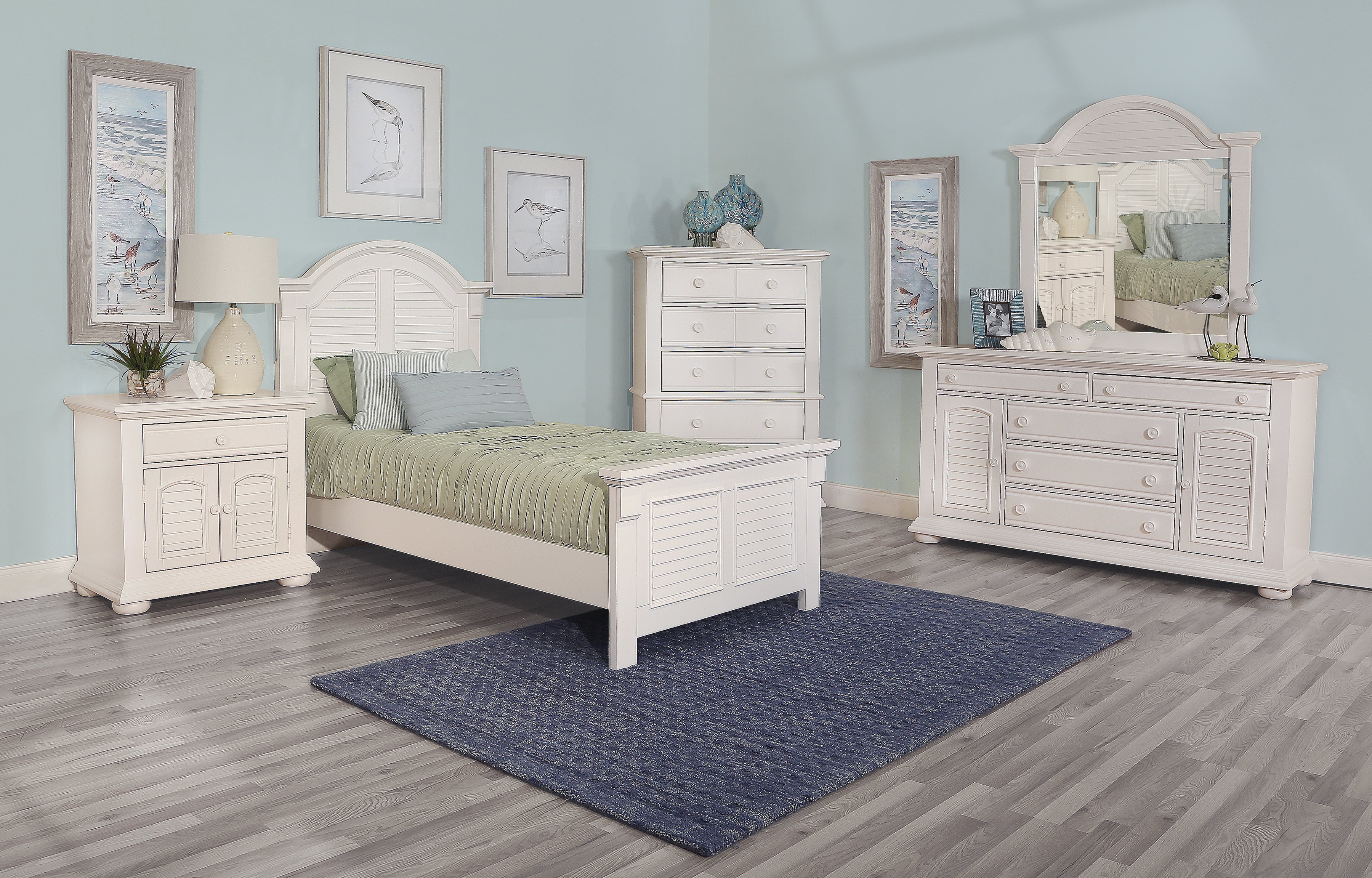 Create a bright and breezy retreat with the Summer House White 5 Piece Twin Bedroom. Crafted from poplar and pine solids and finished in a soft oyster white, this set brings coastal charm to any space. The twin panel bed features elegant arched crown molding and louvered insets for a relaxed, tropical feel. Quality details like all-wood pulls, full-extension metal drawer glides, and French and English dovetail joinery ensure lasting durability. This set includes a twin bed (headboard, footboard, rails), dresser, and mirror, making it the perfect choice for a fresh and inviting bedroom. The twin bed supports up to 500 lbs for comfort and peace of mind.