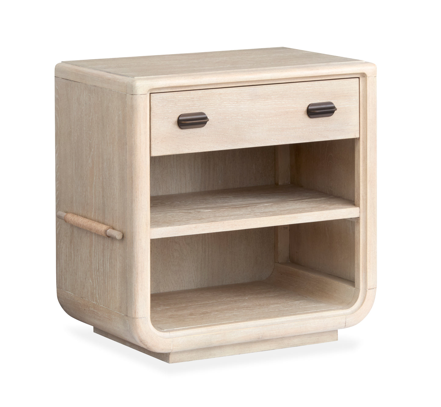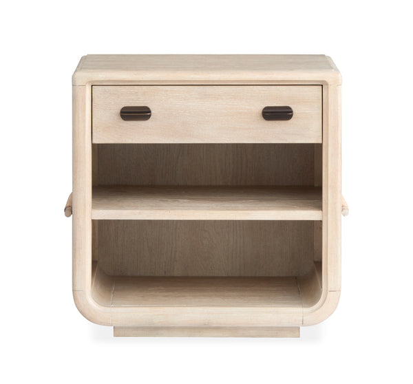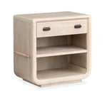 One drawer open nightstand featuring a soft Sanibel Sand finish on knotty Cathedral White Oak. This nightstand features cord wrapped accents, bronze-finished drawer pulls, felt-lined top drawers, and partial extension steel ball-bearing drawer glides for enhanced functionality and style.