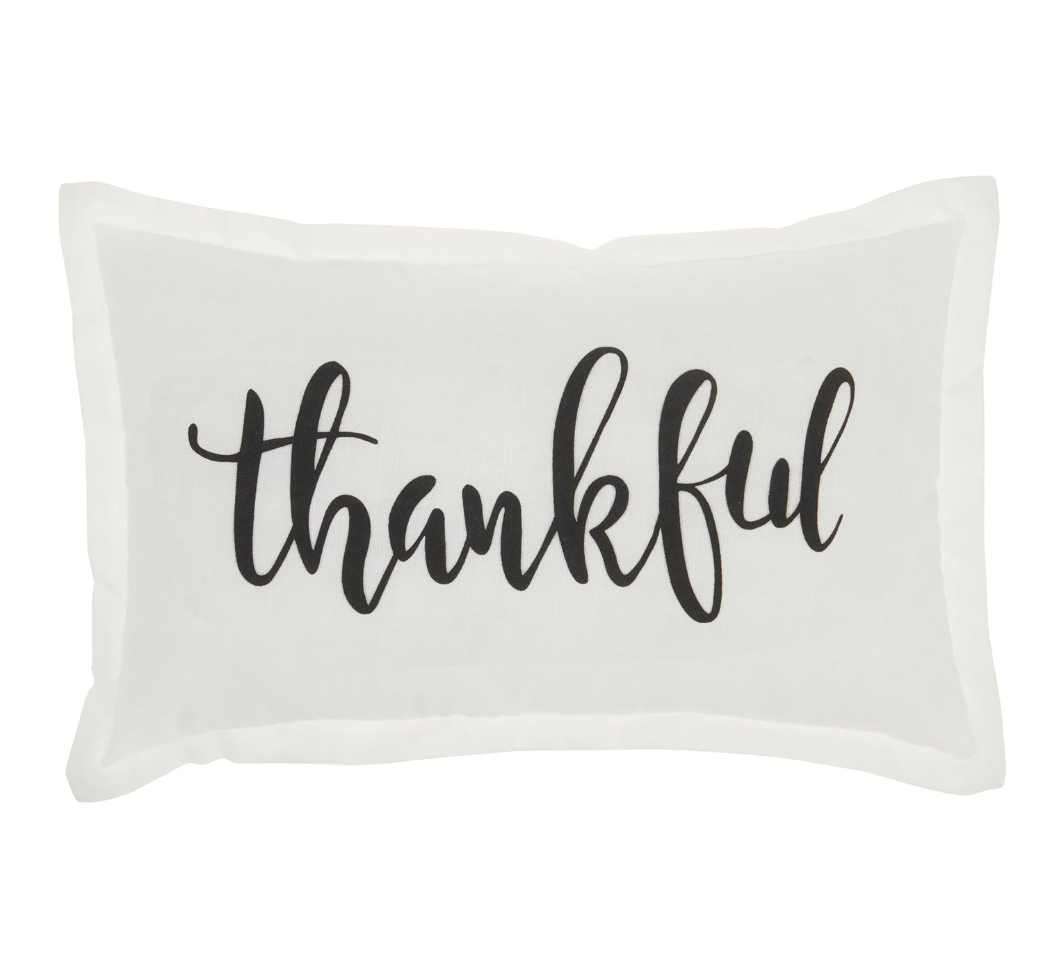 Celebrate all that you are thankful for with the crisp design of this oblong throw pillow. The word "Thankful" is scrolled in beautifully stylized script on a classic white cover, which is finished with flirty flanged edges designed to deliver a chic and timeless look to your modern farmhouse or country cottage. Handmade of soft polyester in a 12-inch x 20-inch rectangle. Includes a fluffy polyester fill for a delightful lounging experience. Pattern appears on face only.