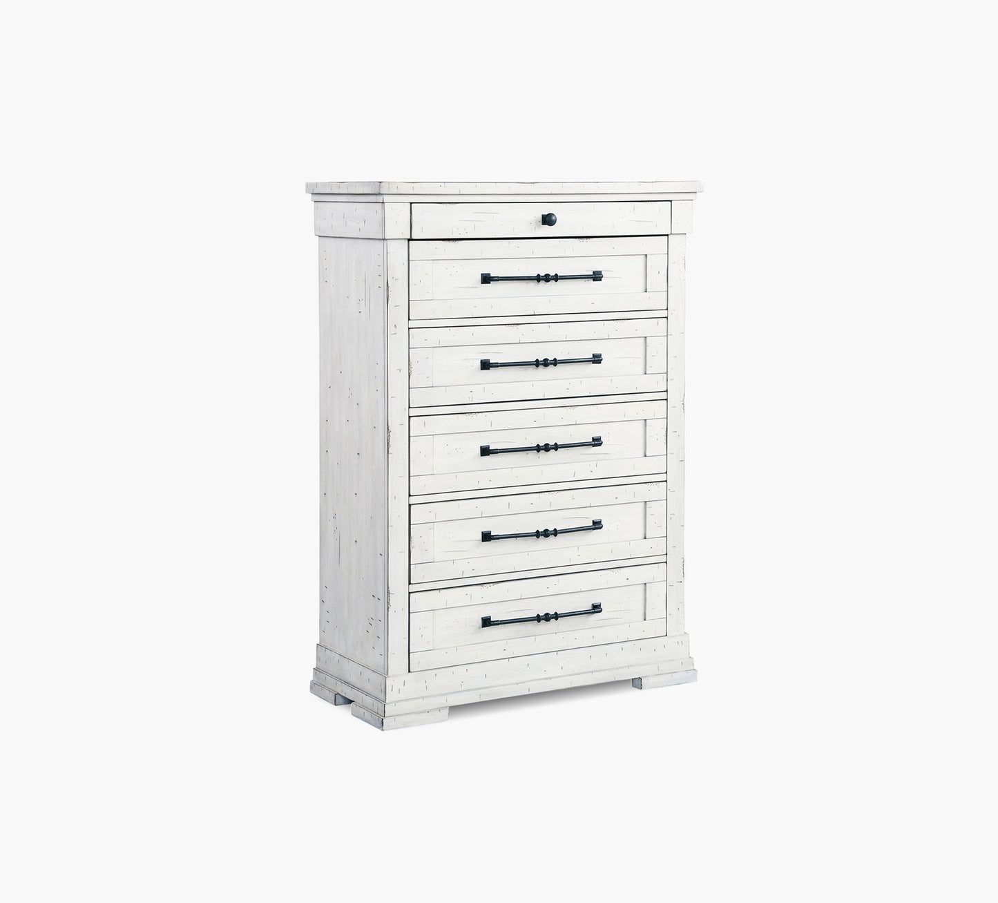 The Trina 6 Drawer Chest combines classic style with practical storage in a design that feels warm and inviting. Finished in a weathered white with vintage-inspired chatter marks, this chest adds character to any bedroom. Crafted from solid poplar, poplar veneers, and engineered wood, it offers lasting durability and beauty. Picture frame drawer fronts are accented with contrasting bronze hardware for a touch of elegance. Each drawer features full-extension ball bearing guides and sturdy dovetail joinery for smooth operation, while the top drawer is felt-lined to protect delicate items. This chest is the perfect blend of charm and functionality.