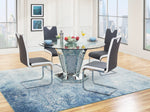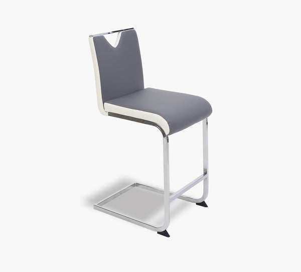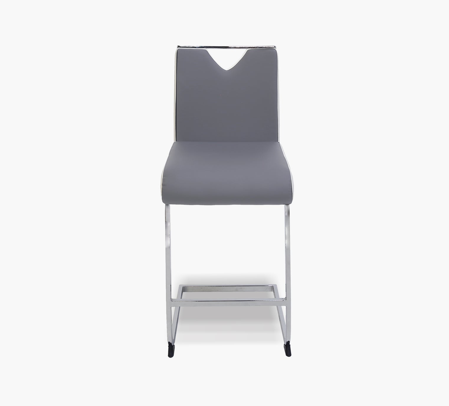 Counter stool with easy care grey polyurethane upholstered seat and back on a chrome finish tubular steel frame. Contrasting white welt on sides.