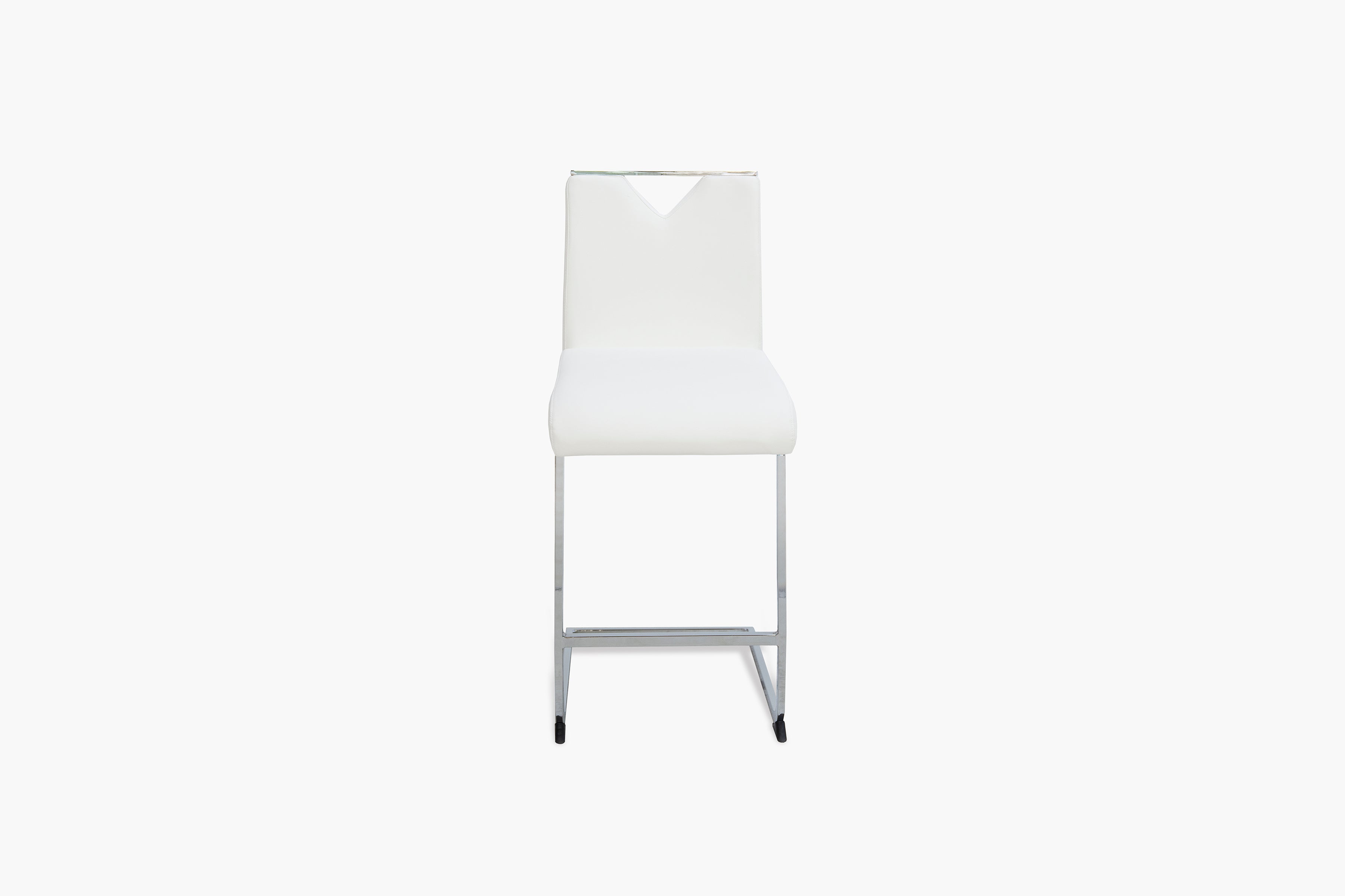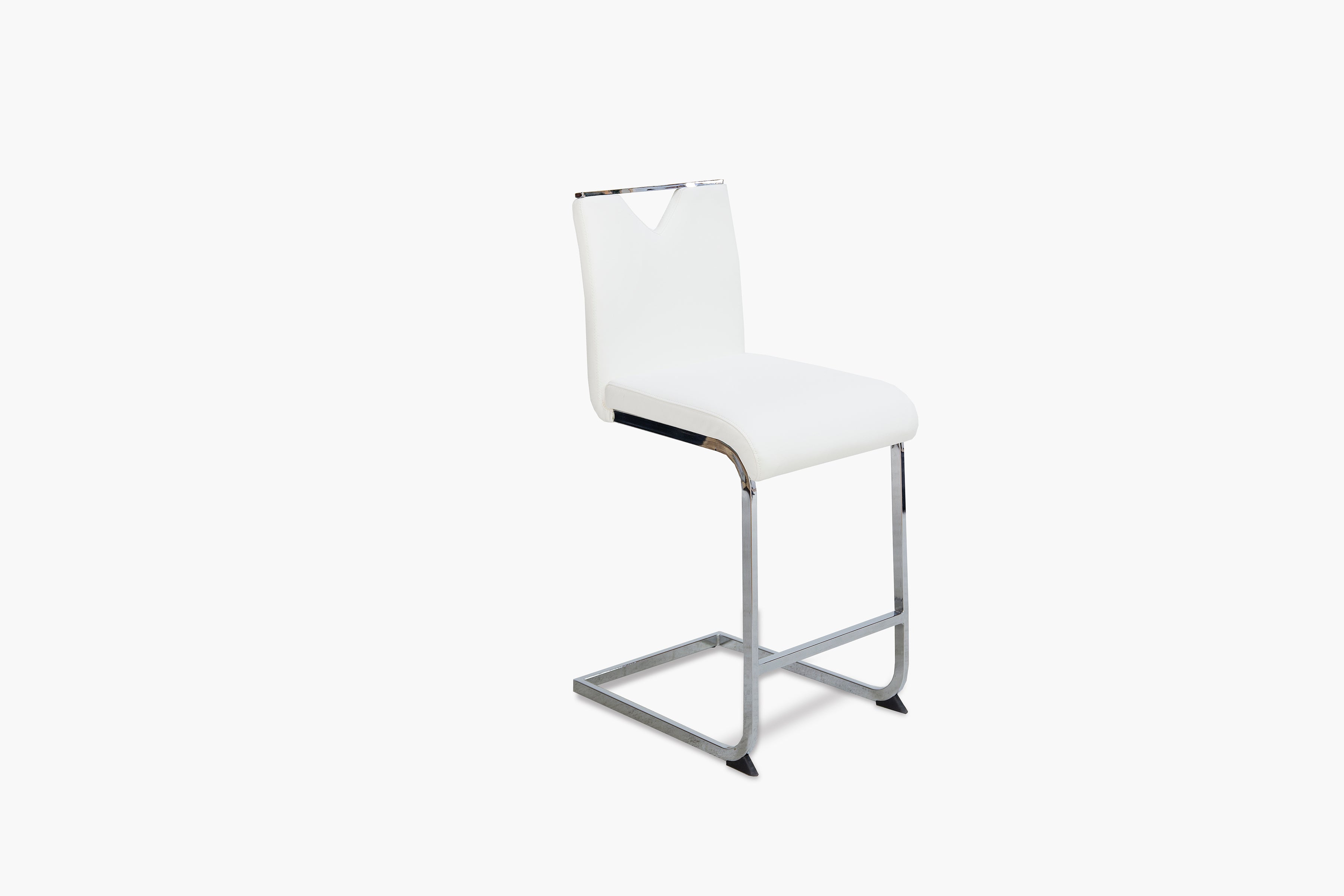 Counter stool with easy care white polyurethane upholstered seat and back on a chrome finish tubular steel frame.