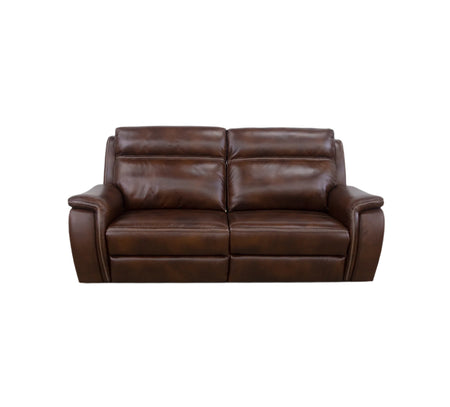 Premium top grain leather matched with vinyl on outside arms and back. Large scale power recline with power headrest. Unique contrast whipstitch detail. Supportive 41" back with power headrests are great for watching TV while reclined. Pad-over chaise footrest features extended ottoman and offers incredible comfort. Requires 4.5" wall clearance for full recline.
