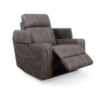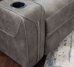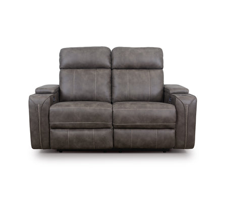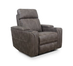 Contemporary power recliner upholstered in a grey performance fabric with a whipstitch detail that replicates a leather look. Features power headrest, power lumbar, and power recline with pad-over chaise ottoman. Includes a home button with a stop/start feature and removable black metal cupholders. Arms include hidden storage with soft-close lids and USB/USB-C charging ports. 100% Polyester CC: X