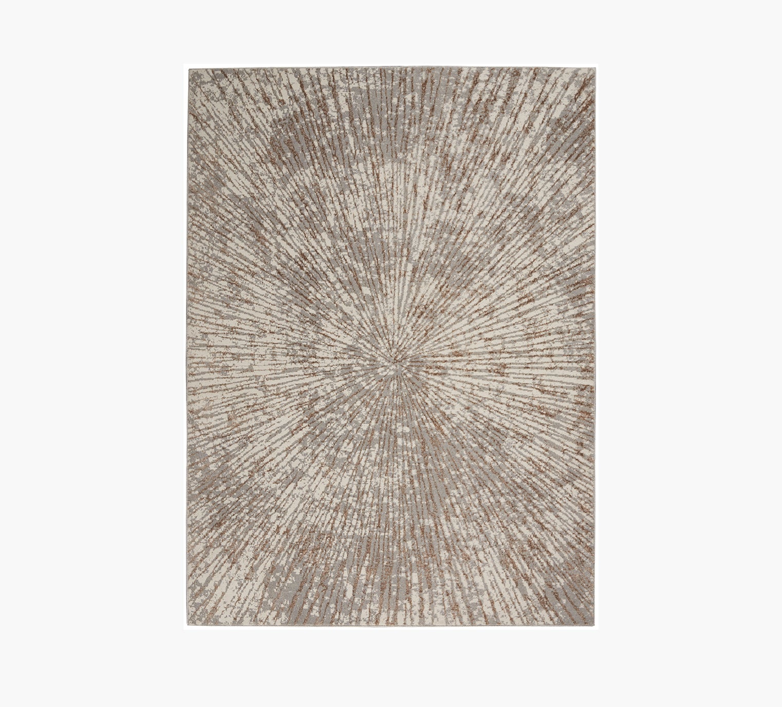 Elevate your space with the dazzling starburst design and luxurious texture of this modern rug! Power-loomed from silky polyester fibers with metallic accents, it offers a soft touch and the convenience of low-shed, easy-care performance. The abstract pattern in rich gold and silvery grey exudes subtle glamour, complete with a polished serged edge for a refined finish.