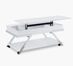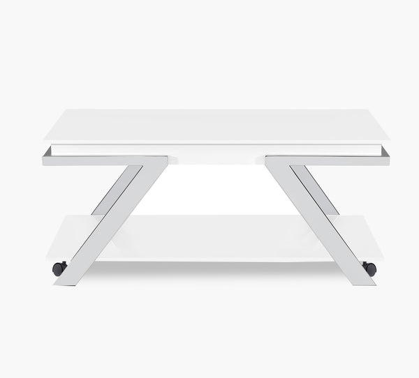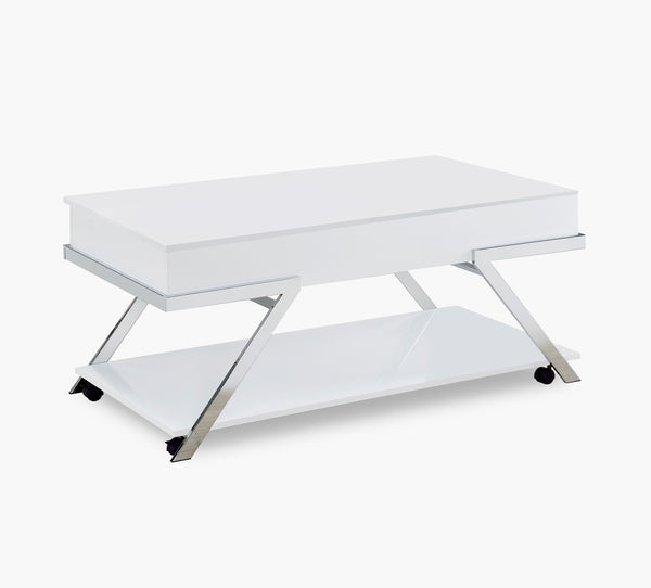 Midcentury modern style with a glam touch.Adjustable lift top.Geometric canted chrome legs.Open bottom shelf for storage.Casters for easy mobility.