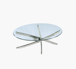 Contemporary brushed nickel finish metal base with fused glass top. Tempered 10mm ogee edge oval glass top. Metal base includes levelers.